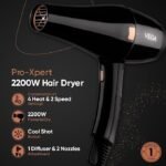 Vega Pro-Xpert 2200W Professional Hair Dryer for Women with 2 Speed/3 Heat Settings, Cool Shot Button, Diffuser & 2 Detachable Nozzles, Travel Friendly, (VHDP-03), 2000 Watts, Black